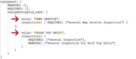| MT-776 | We've added wild card character functionality to appointment and inspection linking in Offline HTML if you (optionally) limit to a specific value such as a service call type or equipment type. This would provide you with the ability to group similar entities. The wild card character's default value is %, however, you can edit this by updating the wildCardChar variable value found in utility\questionnaire\link-appointment.js. This wild card character can be used on any field for the service call, job, or equipment. See Inspection Validation During Appointment Validation Check (optional). The wild card character can only be added to the beginning or end of the entity's field value, For example, %AMP SERVICE or AMPSERVICE%. Not allowed would be AMP%SERVICE. An example of how this might be used so that anything equipment type that ends with AMP SERVICE or anything that has ROOF TOP UNIT with text before and/or after in the name: ![]() |