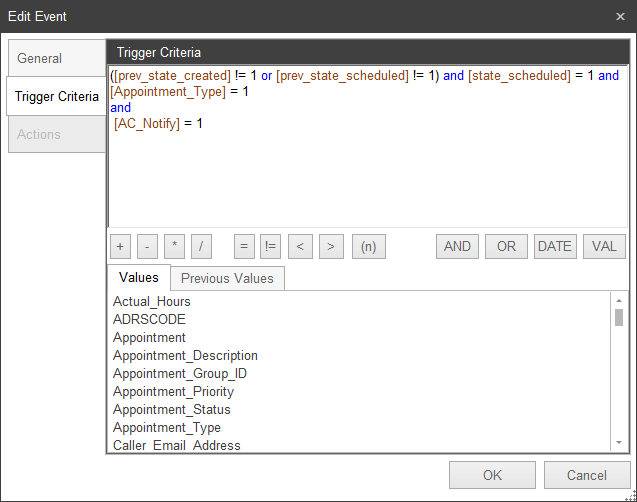 - Use the Values and Previous Values tabs and the formula buttons to create the trigger criteria. To enter the values necessary for the formulas, select the VAL button and enter the data.