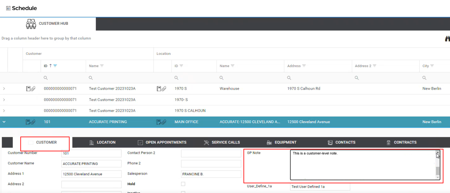 SCHED-1704 | From the Customer Hub, users can now see notes added at the Customer level in Signature. The notes cannot be added or edited in Schedule. The examples below are for the customer level note. In Schedule, the note displays on the Customer tab in the Customer Hub. This note is display-only. |