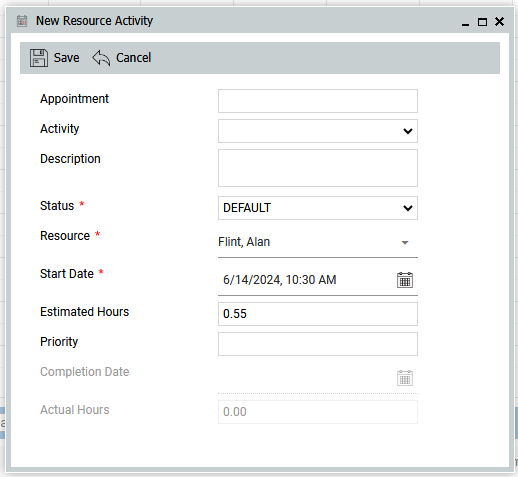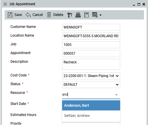 SCHED-1391 | For service appointments, job appointments, and service calls, the Resource field now allows you to filter and quickly locate the technician. As you type, the drop-down menu will display names that match the entered characters. |