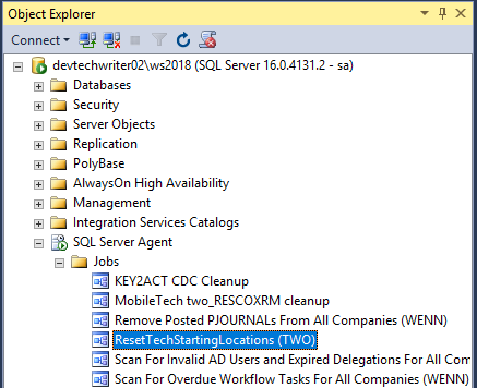 SCHED-1267 | We've added a ResetTechStartingLocations (Company DB Name) SQL job to automatically reset technicians' starting locations. This SQL job is added for each company selected during your Schedule 2024 upgrade installation. The SQL job defaults to disabled and you will need to enable this in SQL Server Management Studio (SSMS). The job is set up to run every 8 hours, beginning at midnight. The default run times are midnight, 8 AM, and 4 PM to accommodate three shifts with a two-hour grace period at the end of the shift. The ResetTechStartingLocations job's schedule can be edited. For more information, see Automatically Reset Technician Starting Locations. The ResetTechStartingLocations job does not run during a technician's shift. For example, if a technician's shift is: