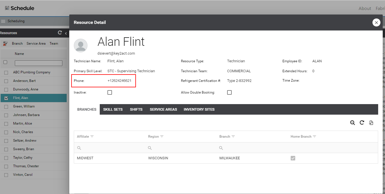 SCHED-1680 | The technician's telephone number has been added to their Resource Detail window accessed from the Resources list on the Schedule Board. See Viewing Resource Details. |