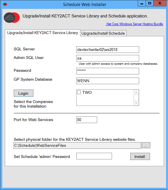 Choose Login to display the company/companies and then choose the Company for this Installation This option lets you set up multiple companies during one installation. If you later have a need to install the Schedule Web Service for more companies, see Install the Schedule Web Service for Additional Companies.