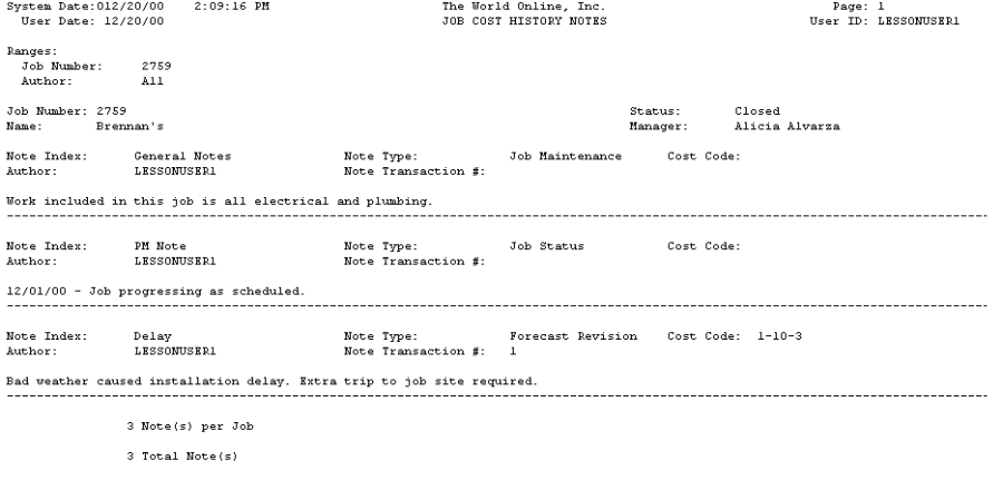 The Job History report lists committed, posted, estimated, and forecasted costs for each cost element, as well as estimated gross profit, change order, and other job information for closed jobs.