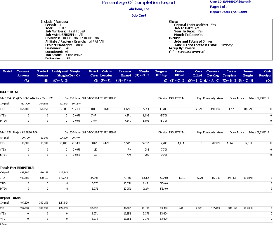 This report allows management and project managers to view totals and Year-to-Date and Month-to-Date summaries for all fields related to Percentage of Completion. This report helps tie WIP, COGS, Progress Billings, and Sales subledgers to GL balances and activity, as well as performance indicators such as Contract Backlog, Earned Margin, Future Margin, Cost to Complete, Under-Billed, and Billed in Excess of Earned. Users can view combinations of Active, Inactive, and Closed jobs for a period, sorted and subtotaled by Job, PM, or Division. Senior managers can view the details for each job in the period or display subtotals only.