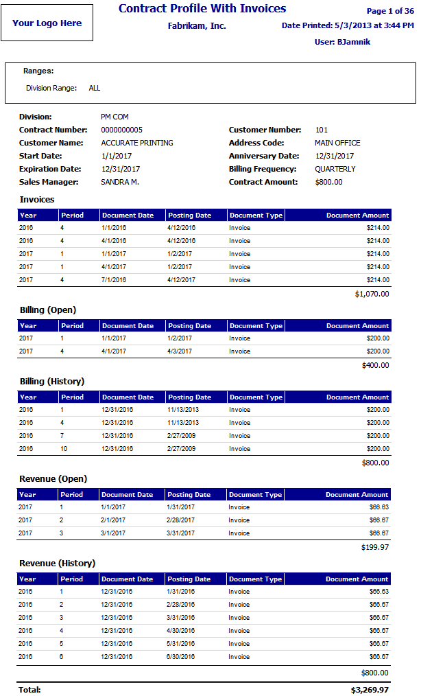 This report allows you to view a summary of a contract's invoice, billing, and revenue amounts over time. Contract amounts are broken down into categories, allowing you to view invoice, current billing, historical billing, current revenue, and historical revenue records and subtotals. You can also view contract totals. Select a division range to view the contracts in each division. Invoice, billing, and revenue amounts display for the contract by year.