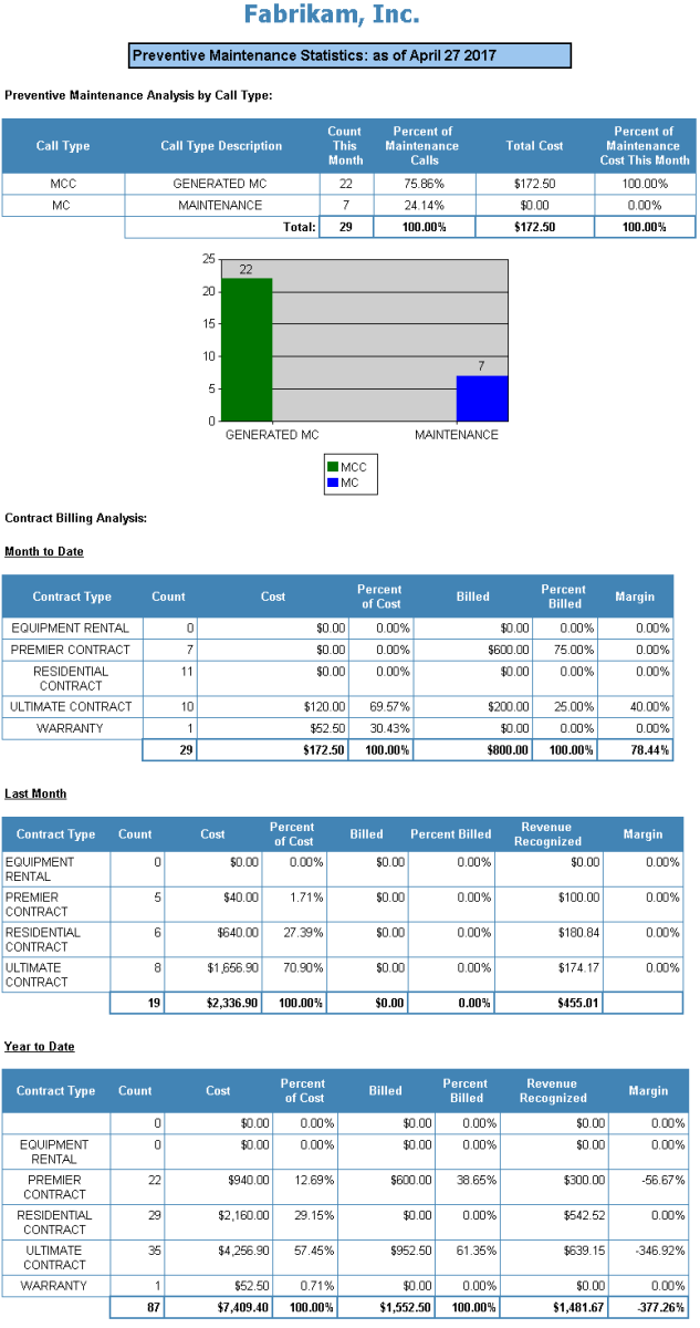 This report shows monthly statistics for Preventative Maintenance service calls, per call type. This allows you to track costs for preventative maintenance. You can also view cost and revenue information by contract type, which allows you to keep track of margin percentage. This report shows service call costs, billed amounts, and revenue for the month to date, last month, and year to date, and contract type.