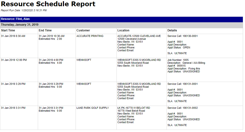 The Resource Schedule report can be printed for a specific resource or you can print this for multiple technicians. This report is printed from Schedule and you can also print this from the SSRS server.