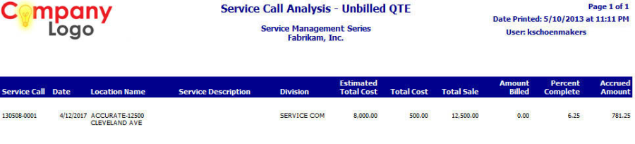This report allows you to view unbilled QTE service calls, and the estimate cost amounts that are yet to be billed. Enter a date range to view a list of service call quotes with unbilled amounts. You can view the estimated cost, total cost, and amount billed for each service call, as well as total sale, percent complete, and accrued amount.