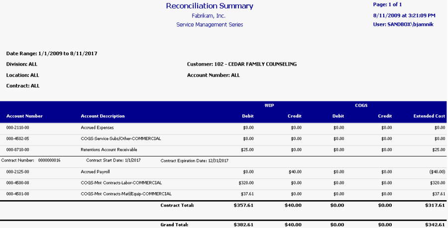 This WIP report allows you to review the debits, credits, and extended costs in your WIP and COGS accounts, along with a summary of the debits and credits in the accounts for each contract. The Service Reconciliation report can be run as part of the month end closing process, to reconcile the amounts posted to your Progress Billings accounts and Service WIP accounts. Refer to the user manual for more information on using WIP reports at month's end.