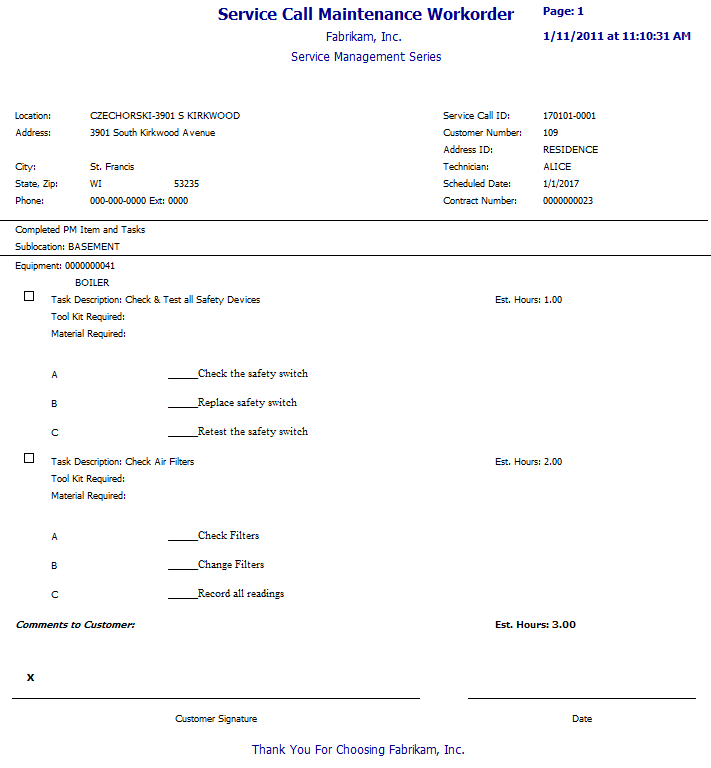 This report describes the work that is to be done for a scheduled maintenance service call. When MCC calls are generated for a month, you can print this report to view service call details, including hour estimates and required equipment, materials, and tool kits. When work is performed on site, tasks and subtasks can be marked as complete. If SRS reports are set up to print from GP, this report can be printed from the Maintenance Tasking window during the call creation process (Microsoft Dynamics GP > Tools > Routines > Service Management > Maintenance Contract > Create MCC Calls). This report replaces the Scheduled Maintenance Dexterity report. In Report Manager, you can select the year and month that you want to view MCC calls for. Calls can be filtered by a customer range, a technician range, location, or contract number.