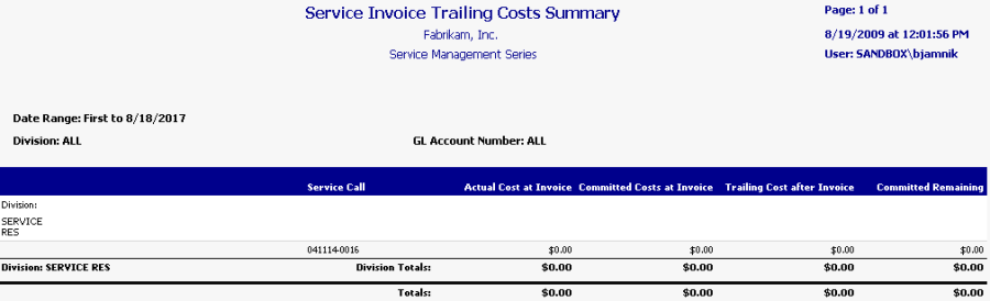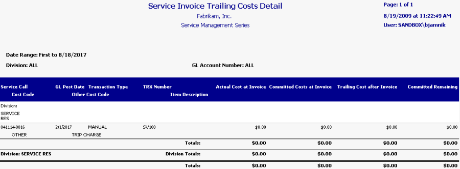 This WIP report prints trailing costs by division and service call. For each service call, you can view actual and committed costs at invoice time, the trailing cost after invoicing, and the committed cost remaining, along with division totals and totals for the whole report. The detailed invoice shows additional service call and transaction details. The Service Invoice Trailing Costs report can be run as part of the month end closing process, to help identify the committed costs that remain unposted after a service invoice is posted for a closed service call. Refer to the user manual for more information on using WIP reports at month's end.