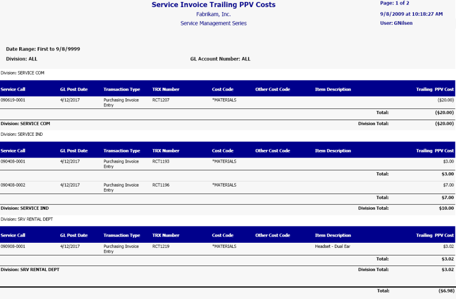 This WIP report lists trailing PPV costs by service call and identifies the transaction number, GL posting date, and cost code of each trailing PPV cost. Service calls are arranged by division, allowing you to view both service call and division totals, as well as trailing PPV cost totals for the entire report. The Service Invoice Trailing PPV Costs report can be run as part of the month end closing process to help identify the trailing costs that remain due to a purchase price variance (PPV) that appeared on a receipt. Refer to the user manual for more information on using WIP reports at month's end.