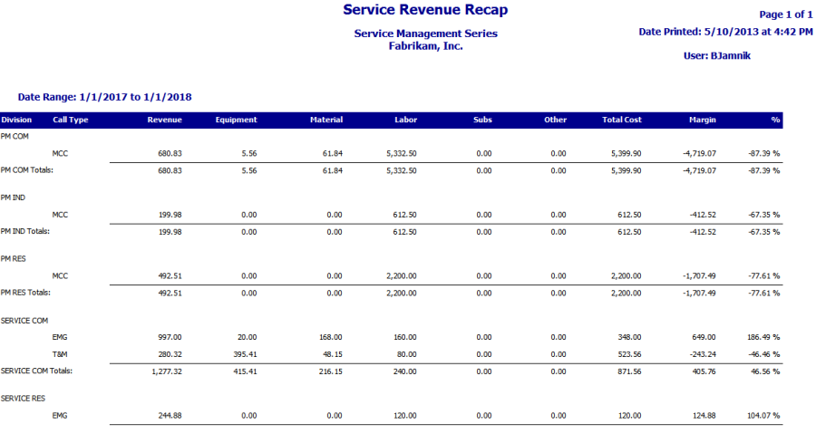 This report allows you to view revenue amounts by division and call type. You can view costs by category, the total cost, and the margin amount and percent for each call type in a division. Additionally, subtotals display for each division, and report totals summarize all revenue for the divisions displayed on the report.