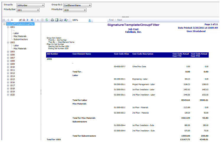 Example: You may decide to use this template to create a Job Cost Code Report. Additional fields such as Cost Code Actual Cost TTD and Cost Code Actual Cost YTD are added as columns when editing the report template in Report Builder. In Report Manager, values are grouped first by Project Number. Values are grouped next by Cost Element Name, Cost Element ID, or Cost Code Alias. Values are filtered by Project Number, as this is the first Group By field.