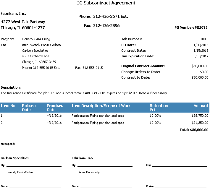 This report consolidates job-level information from the Subcontractor Maintenance window into a form for subcontractors; this simplifies the process of putting together contractual agreements. The form includes the retention percent and description, as well as information from a linked purchase order such as the dollar amount and a detailed scope of work. In addition, the fields that print on the form allow you to see that the Job Cost system is set up with the correct terms and conditions.