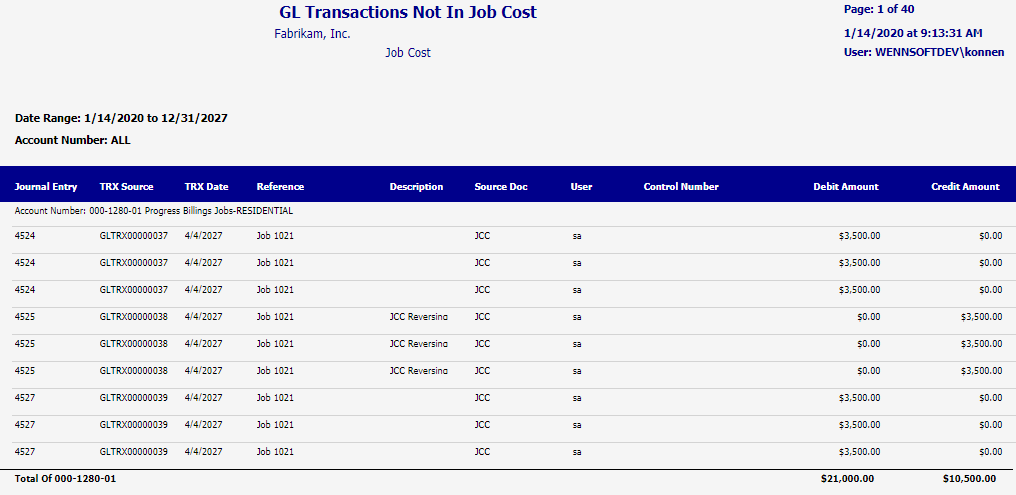 This WIP report shows transactions that have been posted to the General Ledger but have not been posted in Job Cost. You can view debit and credit amounts for each transaction by account, including account totals and grand totals for the report. The GL Transactions Not in Job Cost report can be run as part of the month end closing process, to help identify costs that have been posted to the GL but not in Job Cost. Refer to the user manual for more information on using WIP reports at month's end. To print, choose Reports > Job Cost > Job Reports > Audit Reports > Job WIP Reports. On the JC WIP Reports window, mark the Exception Report radio button, then choose GL Not in Job Cost. You can filter this report by account number.