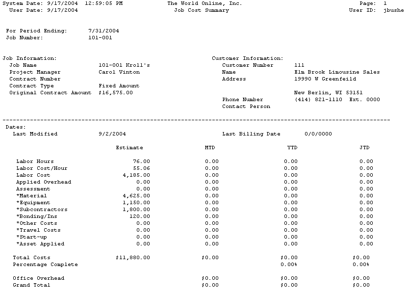 The Job Summary report contains a summary of the all job information for a specified job within a specified fiscal period. This includes billing information, estimates, contracts, and customers. Labor for a job is broken down by labor hours, cost per hour, and total labor cost.