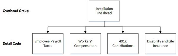 Overhead group codes organize overhead detail codes logically per departments, positions, and pay codes. For example, assume you set up detail codes for hourly workmen's compensation overhead and hourly driving time to a site. You combine these details under a group code named Hour and specify that the code applies to technicians assigned to the installation department.