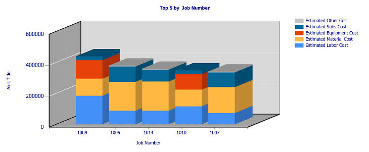 Example: You may decide to use this template to create a Job Estimated Cost report. Values are grouped by Project Number, Project Name, Customer Number, Customer Name, or Estimator. Values are measured by Estimated Labor Cost, Estimated Material Cost, Estimated Equipment Cost, Estimated Subs Cost, and Estimated Other Cost.