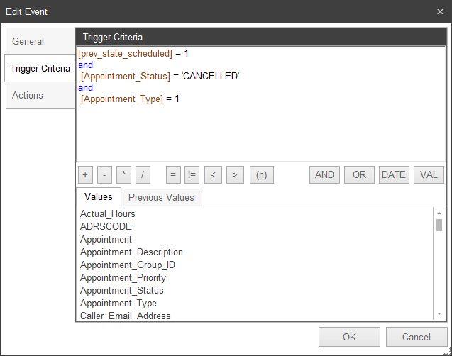 For the example below, continuing to the Trigger tab for the Appointment-AppointmentCancelled trigger event, we are looking at the Trigger Criteria. Note that all of the criteria are joined with an AND which indicates that all three criteria must be met to activate the trigger. If a criteria is joined with an OR, this indicates that either the previous criteria line or the following criteria line must be met.- The Previous Scheduled State (prev_state_scheduled) in the CDC table must be 1.