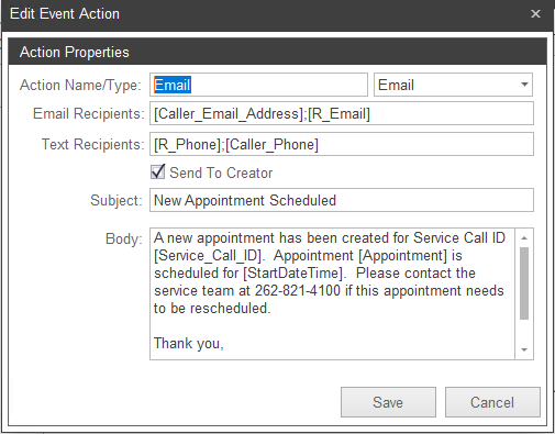 Caller email address: Stored in the Service Call window [Caller_Email_Address].