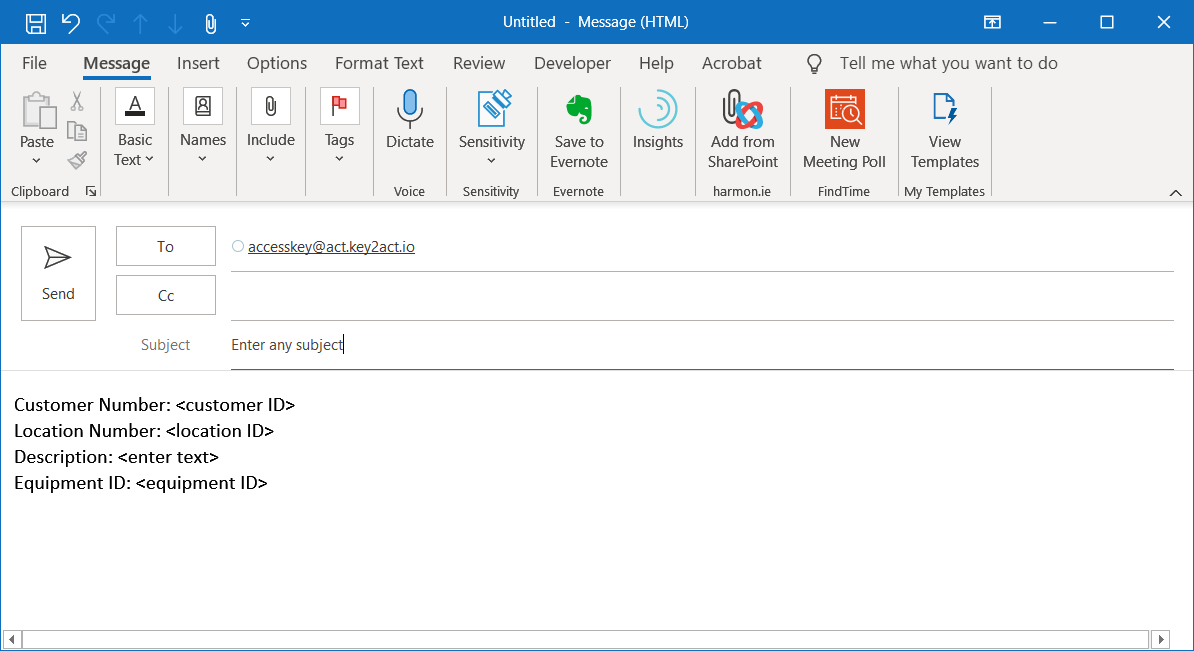- The following lines including the colon ":" in the body of the email are required to generate a service email. Additional fields may be added, like "Equipment ID:".