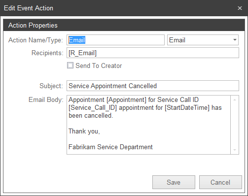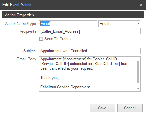 In the following example, two emails will be sent when the Appointment-AppointmentCancelled trigger is activated.