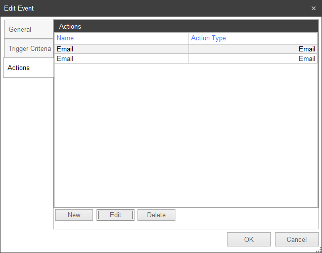 - The Actions tab displays the action properties. The initial display is what is currently out-of-the-box set up and includes the Name and Action Type. This information is fully editable. Select New (to create a new Action) or Edit (to edit an existing Action) to display the Action Properties window.
