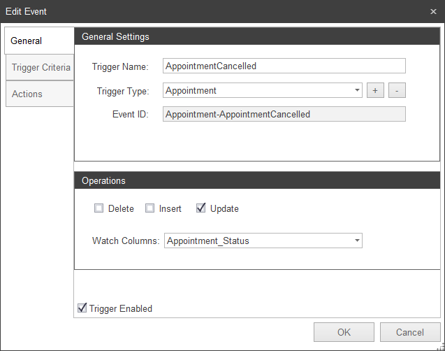 For the example below, continuing to the Trigger tab for the Appointment-AppointmentCancelled trigger event, we are looking at the Trigger Criteria. Note that all of the criteria are joined with an AND which indicates that all three criteria must be met to activate the trigger. If a criteria is joined with an OR, this indicates that either the previous criteria line or the following criteria line must be met.- The Previous Scheduled State (prev_state_scheduled) in the CDC table must be 1.