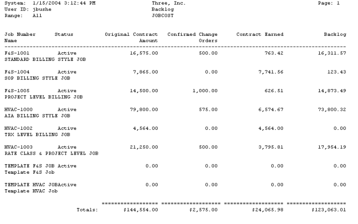 The Backlog report shows original contract amount, contract earned, and backlog amount for all jobs in the selected range. A backlog amount is determined by subtracting the contract earned amount from the job's contract-to-date amount.