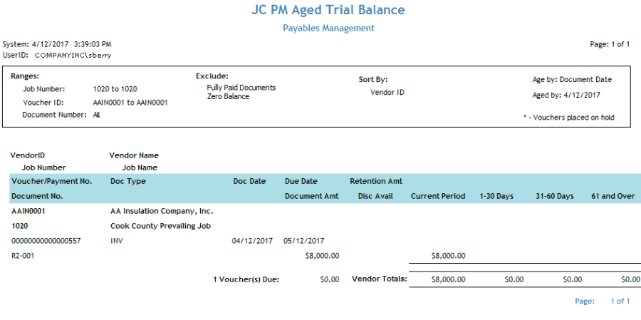 The Payables Aged Trial Balance report contains payables transactions including Purchase Order Processing information for selected jobs and vendors. The transactions are aged per the age ranges set up in Microsoft Dynamics GP.