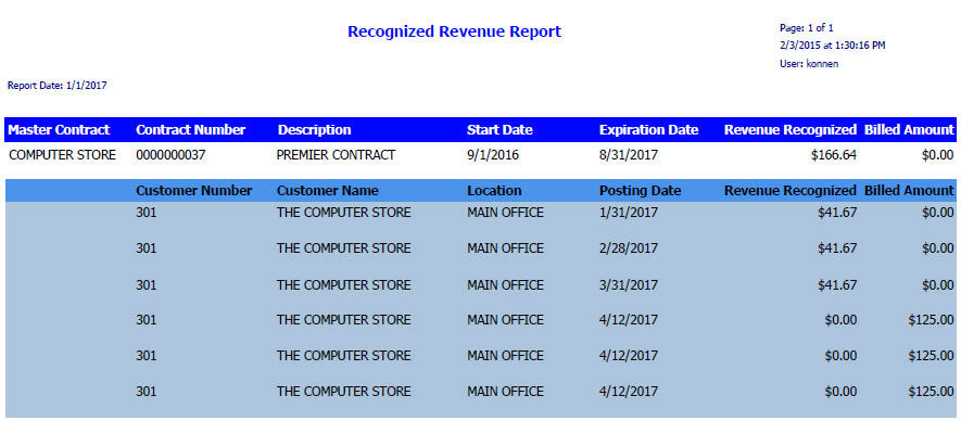 The Recognized Revenue report summarizes the amount of deferred revenue for a maintenance contract that uses the Revenue Schedule method of revenue recognition. You can compare the amount of revenue that has been recognized to the amount that a customer has been billed up to the date that is entered in the report parameters. By expanding the contract line, you can view revenue and billed amounts recognized after the date entered in the report parameters. You can also compare the financial details of the contracts in this report to the balance in the General Ledger Deferred Revenue account during reconciliation. When a preventative maintenance invoice is generated, the Progress Billing or Deferred Revenue account is credited. The account is debited when revenue is recognized. You can view these transactions by contract or account, and this report can be compared to GL activity on the Summary Inquiry window (Inquiry > Financial > Summary). If the Net Change for a general ledger account does not match the transaction detail on this report, the exception reports GL Transactions Not in Service and Service Transactions Not in GL can help you identify issues in Progress Billing accounts, as well as any account that is set up for any division in Maintenance Accounts setup.