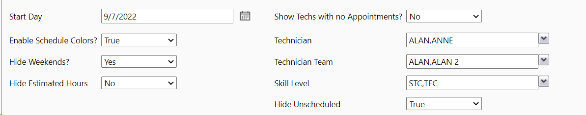 • Show Technicians with No Appointments: Defaults to No. Select Yes to show all technicians.