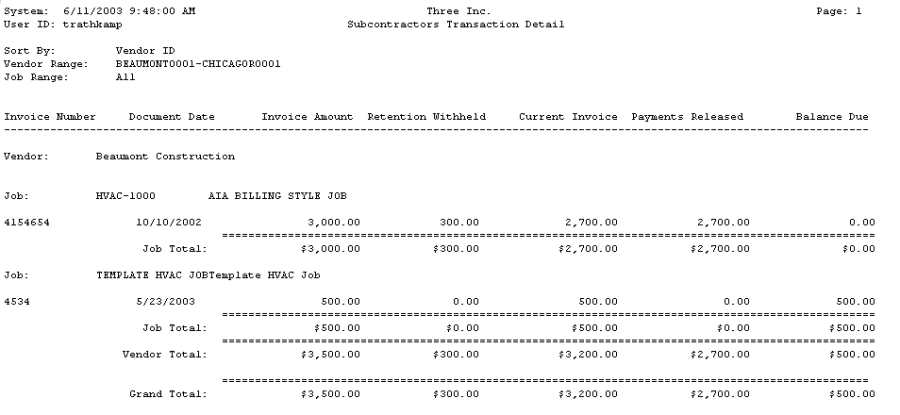 The Subcontractor Detail report contains jobs, contract amount, and invoice detail for each subcontractor.