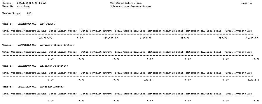 The Subcontractor Summary Status report summarizes contract information for all jobs for which the subcontractor is being used.