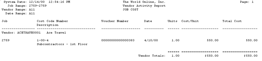 The Vendor Activity report contains a list of vouchers entered for a job, sorted by vendor. The report also includes total units purchased, the cost-per-unit, and the total cost for each vendor.