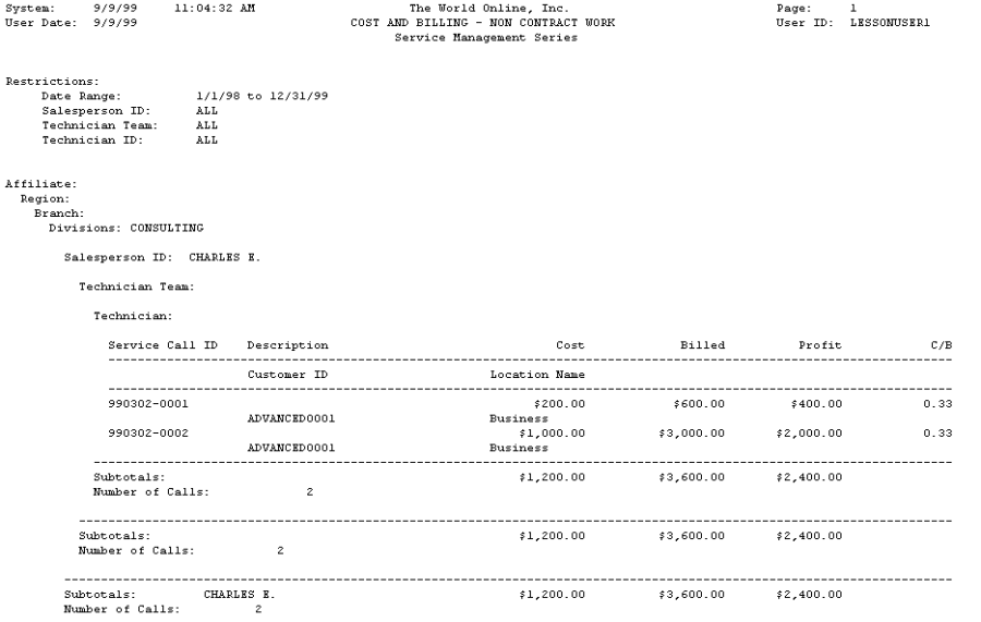 - Select Reports > Service Management > Service > Technician Reports > C&B Noncontract.