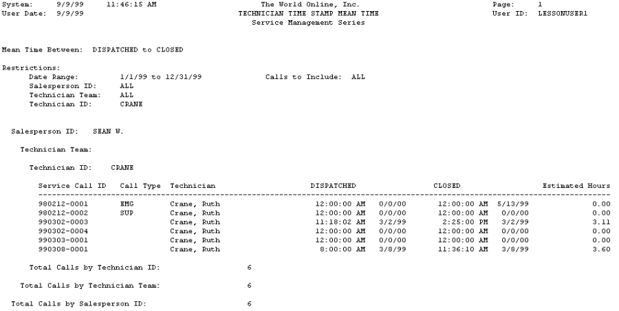 - Select Reports > Service Management > Service > Technician Reports > Service Calls.