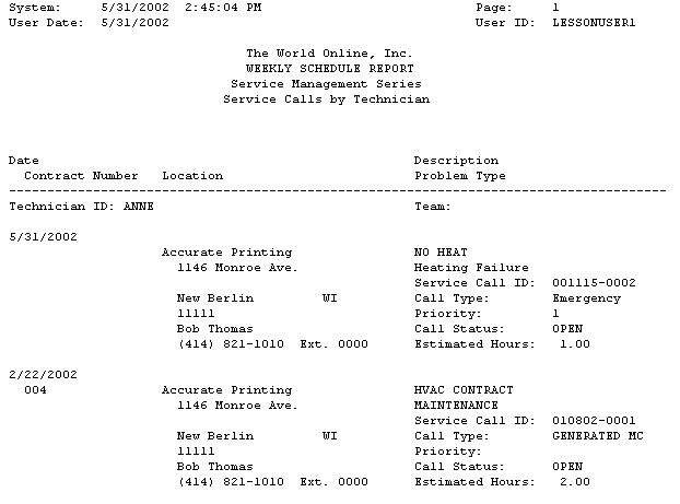 The Technician Service Calls report lists a technician's service calls and appointments.