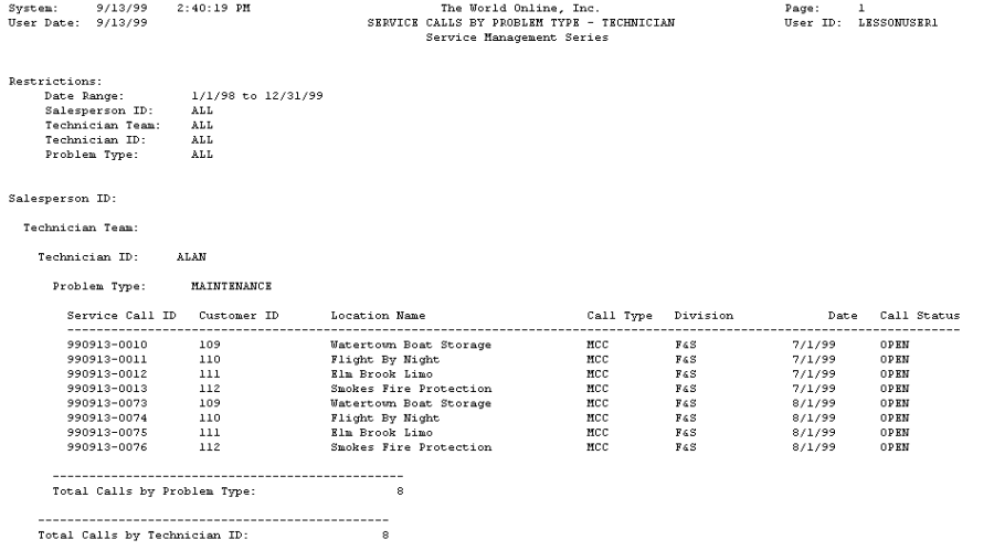 The Service Calls by Problem Type report lists a technician's service calls categorized by problem type.