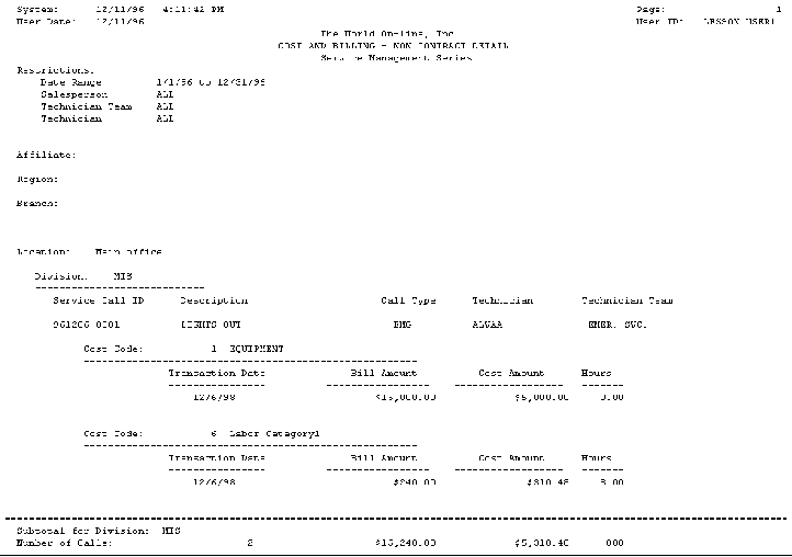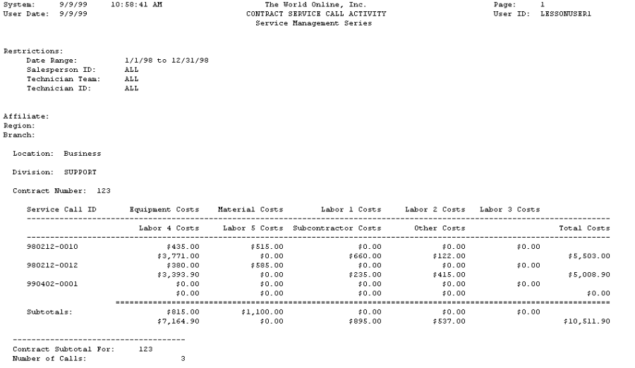 The Contract Service Call Activity report lists the total posted costs of service calls covered by a maintenance contract. The service call costs are reported by cost category of each service call for the maintenance contract. The report is listed by location, then division, then contract number.