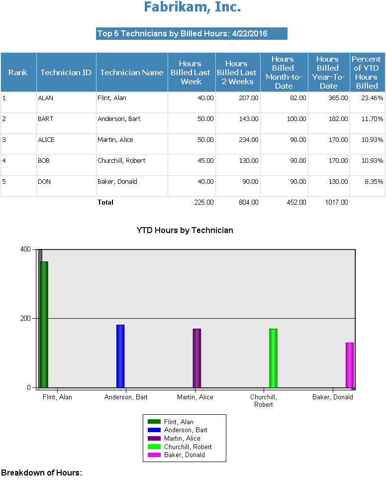 This report identifies the top technicians in terms of billed hours and summarizes those hours for a specified week, the previous week, the last two weeks, month to date, and year to date. This allows you to keep track of the top technicians in terms of billed hours, each technician's percent of the company's total year-to-date hours, and their total hours billed and unbilled over time.