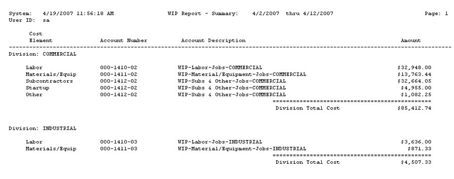 - WIP report: Printed by year and period, this report shows amounts for each job, grouped by division. This is to give you an idea of amounts that are currently unbilled. You can print a summary or detailed version of this report.