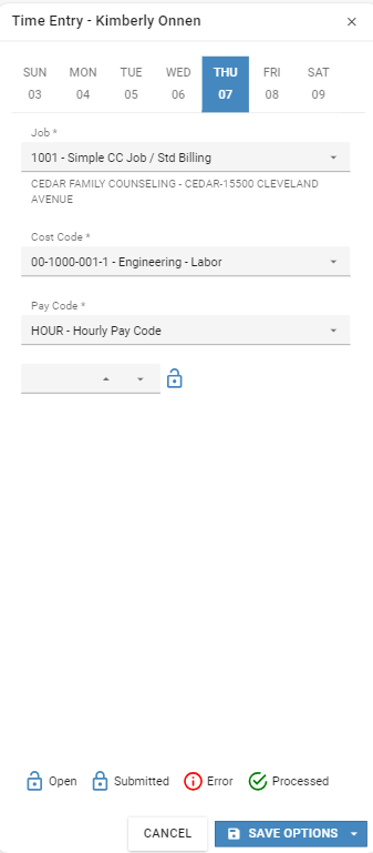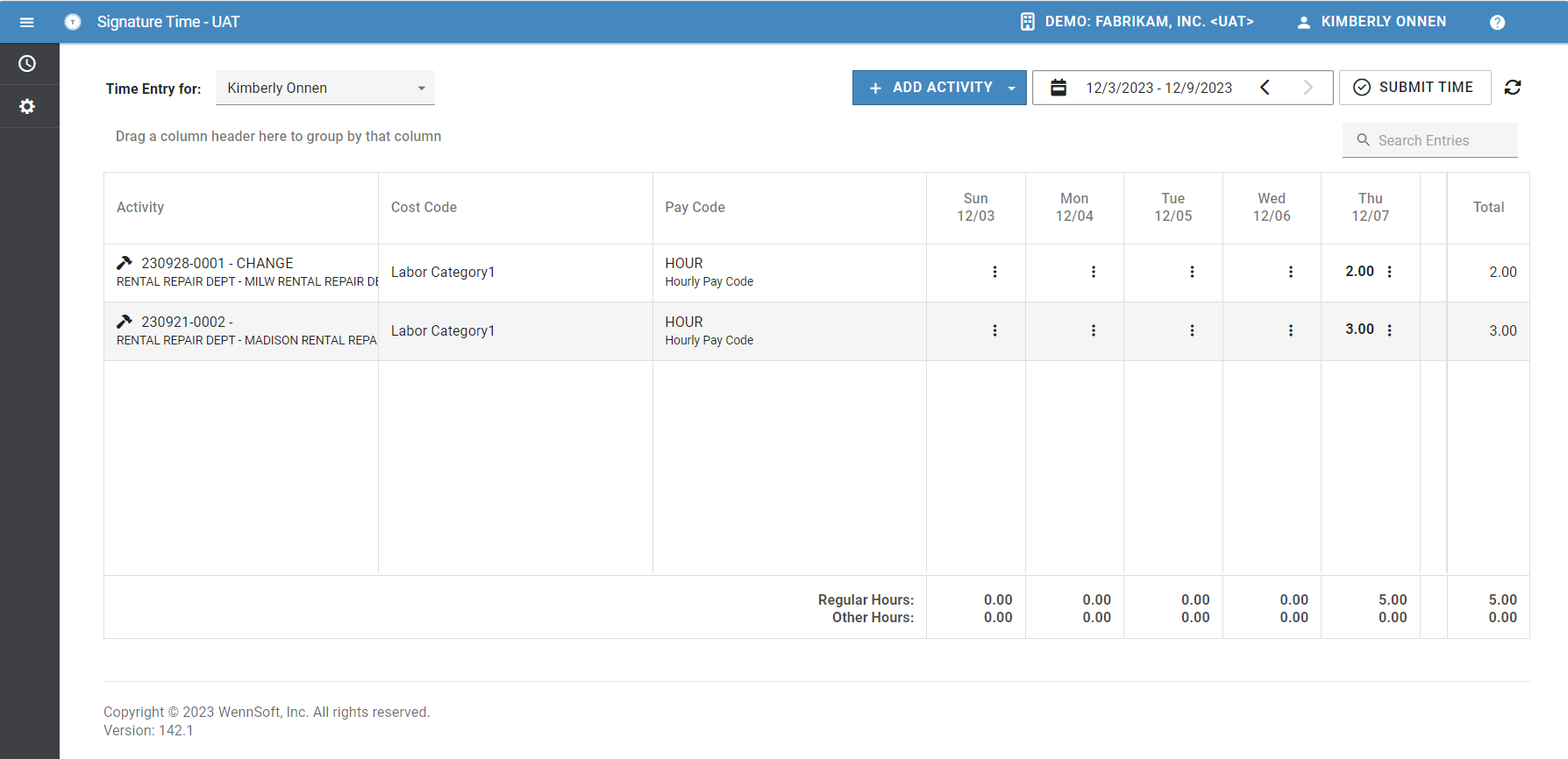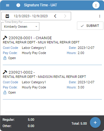KT-1374 | Time entry has been updated to display an entry window. See Working with Time Entries When accessing Time via the website, the Add Activity blue + circle icon that was originally at the bottom right of the window has been moved to above the timesheet list and is a button called Add Activity. ![]() When users are accessing Time via a device either on the web or through the Time app, the Add Activity icon is the blue circle in the lower right corner. ![]() |